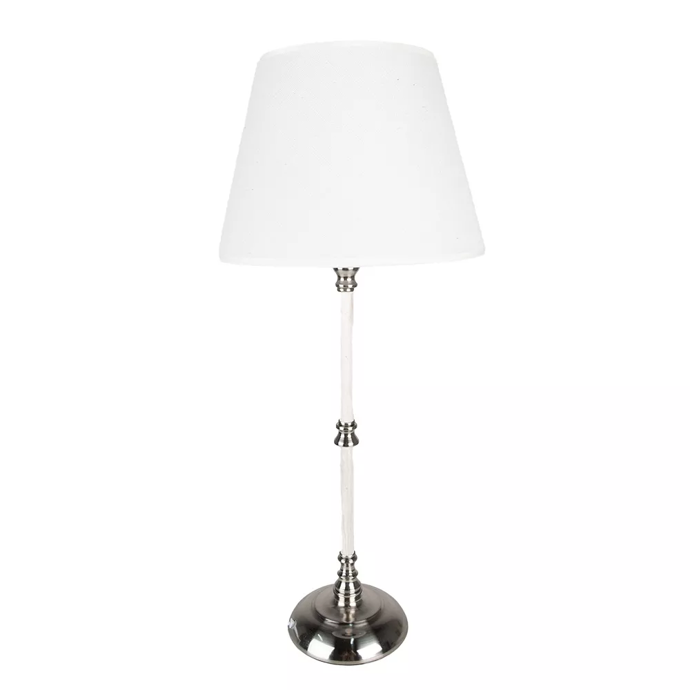Stylová bílá stolní lampa s mimořádně subtilním tvarem a elegantní povrchovou úpravou. Bílo-stříbrný podstavec v kombinaci s klasickým bílým stínidlem je designovým hitem! Taková krásná lampa je nádherným doplňkem do sofistikovaného interiéru. Své místo najde na provensálské konzole nebo bílé komodě.