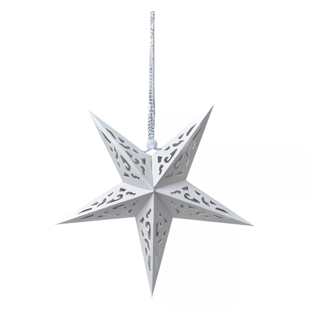 Závěsná papírová hvězda s průřezy v bílé barvě. Papírové hvězdy snadno ozdobí každou místnost a vnesou do každého prostoru pohodu, teplo a kouzlo. Doporučujeme dovnitř vložít led světlený řetěz, vykouzlíte tak jedinečnou atmosféru.