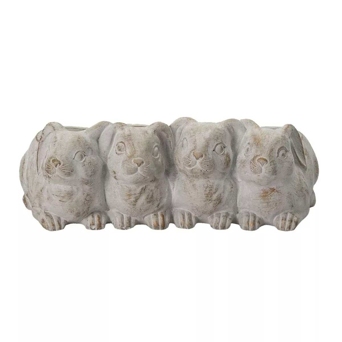 Pěkný cementový květináč šedé barvy ve tvaru čtyř králíků, ve venkovském stylu.
