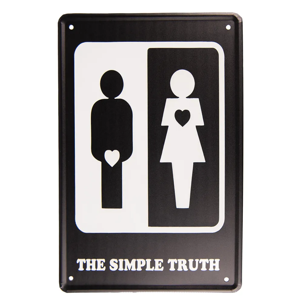 Originální retro cedule s vtipným motivem „The Simple Truth“. Grafika znázorňuje muže a ženu v jednoduchém piktogramu – srdce u muže je umístěno dole a u ženy u srdce, což s humorem vyjadřuje rozdíly mezi pohlavími. Tato dekorativní tabulka se skvěle hodí do garáže, dílny, hospůdky, herny, domácího baru nebo jako dárek pro partnera či kamaráda se smyslem pro humor.