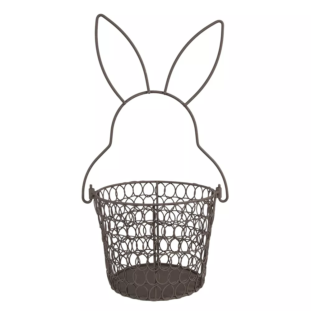 Půvabný hnědý kovový košík s okrajem v podobě králíka. Lze ho použít v kuchyni na uložení ovoce, vajec nebo kraslic v období Velikonoc, ale i jako stylový obal na květináč.