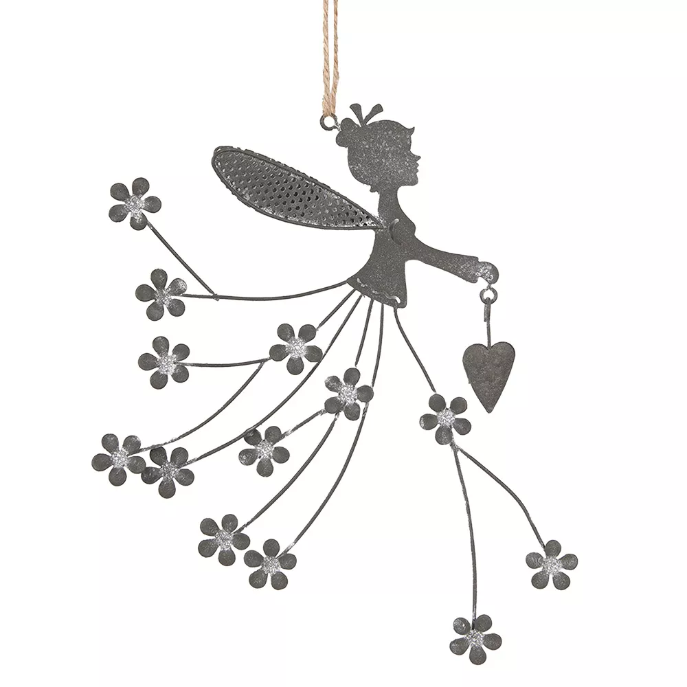 Krásná závěsná dekorace ve tvaru víly. Je vyrobena z kovu v šedé barvě a představuje odolnou dekoraci, kterou lze snadno zavěsit na libovolné místo.