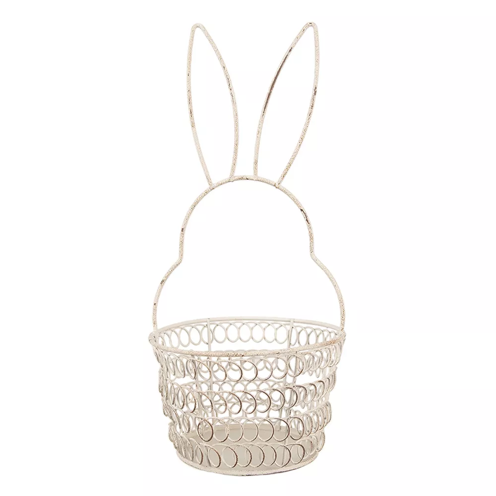 Půvabný bílý kovový košík s okrajem v podobě králíka. Lze ho použít v kuchyni na uložení vajec nebo kraslic v období Velikonoc, ale i jako stylový obal na květináč.