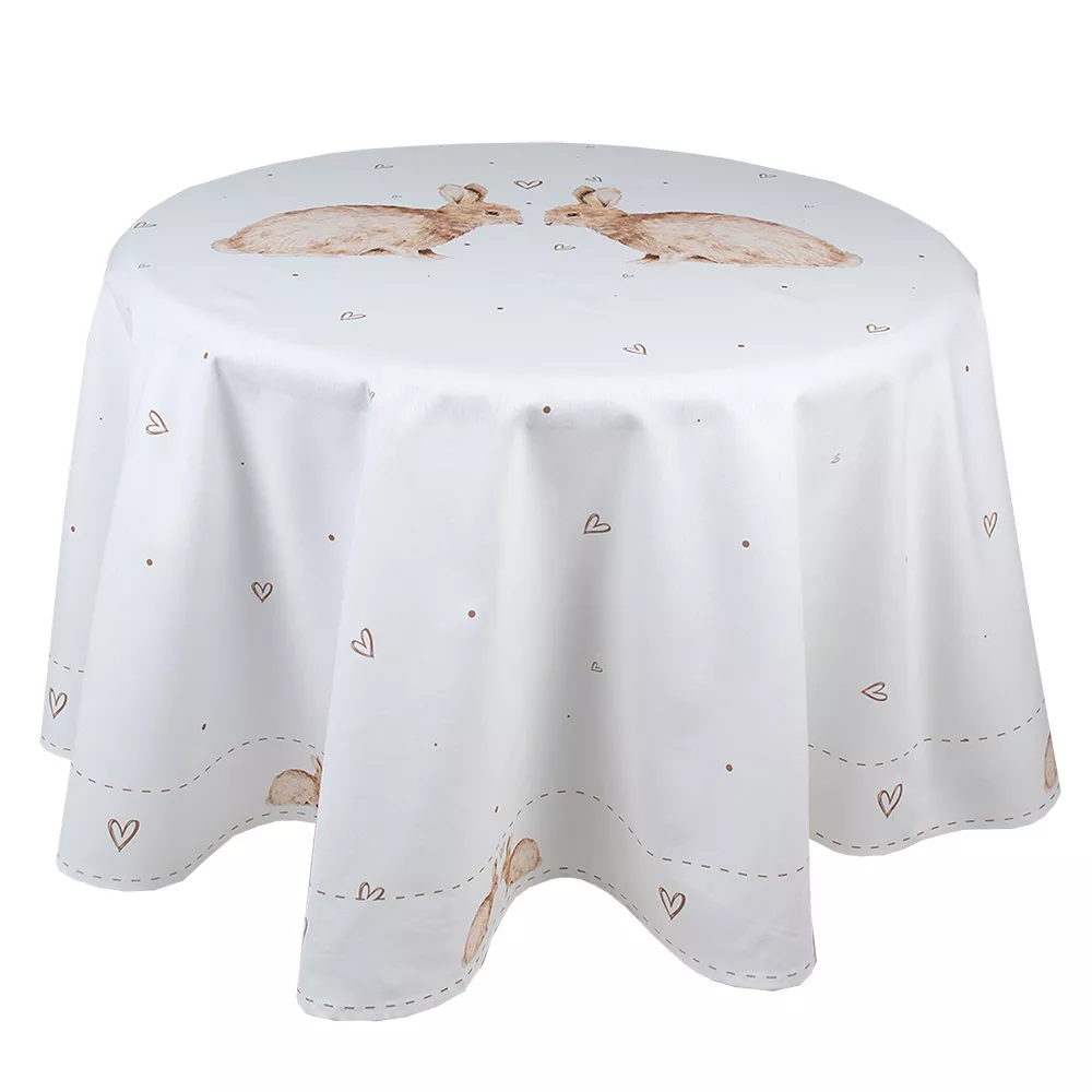 Krásný bavlněný ubrus na stůl v bílé barvě s motivem dvou roztomilých zajíčků, z textilní kolekce BUNNYS IN LOVE. Krásný vzor srdíček dělá z této textilie roztomilou sérii, která vnese do kuchyně pohodu nejen během Velikonoc, ale můžete si ji užívat po celý rok. S předměty, jako je ubrus, prostírání, ubrousky a košíčky na pečivo, je láskyplně prostřený jídelní stůl zaručen.