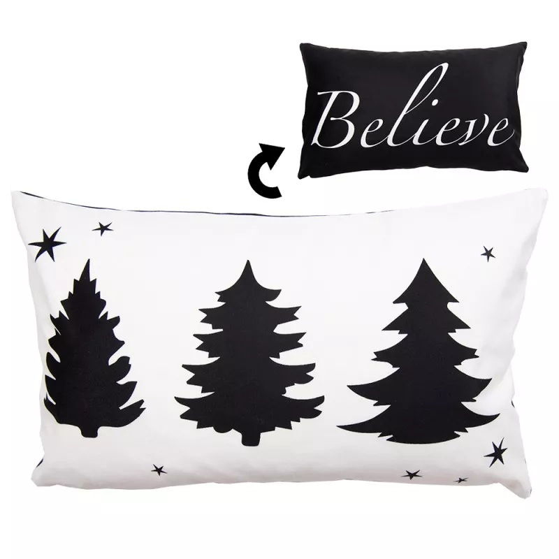 Polyesterový povlak na polštář v bílé a černé barvě s obrázkem vánočních stromků a nápisem Believe. Pěkný dekorativní polštář může dodat místnosti jiný styl, zvláště když jej zkombinujete s polštáři ze stejné série BLACK & WHITE X-MAS. Tato malá série obsahuje černobílý vzor s vánočními stromky na černém nebo bílém pozadí. S předměty, jako jsou běhouny na stůl, kuchyňské zástěry, kuchyňské utěrky, chňapky a kuchyňské rukavice, můžete rychle vytvořit klidnou vánoční atmosféru na stole i v kuchyni.
