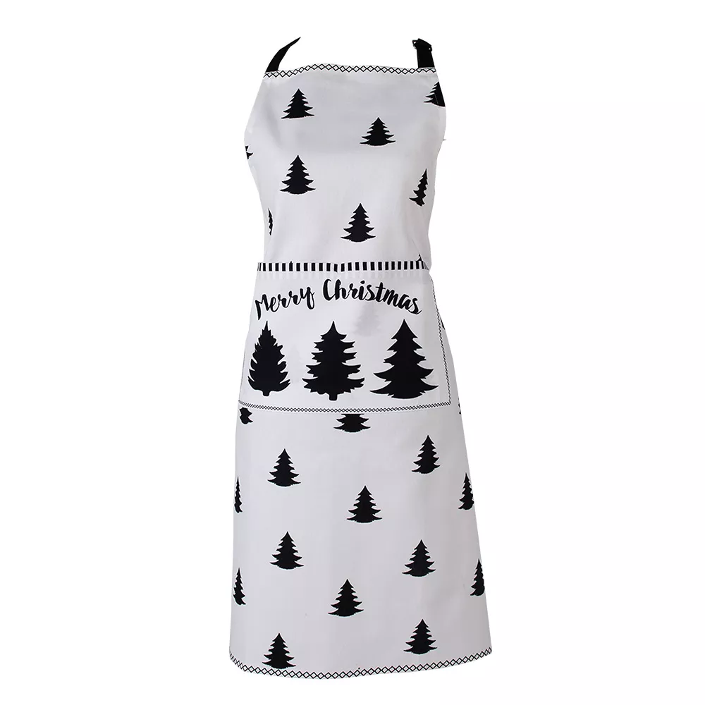 Roztomilá moderní černobílá zástěra s motivem vánočního stromku a nápisem HO HO HO!, z kolekce BLACK & WHITE X-MAS. Tato série obsahuje černobílý vzor s vánočními stromky na černém nebo bílém pozadí. S předměty, jako jsou talíře, hrnky, ubrusy a běhouny na stůl, kuchyňské utěrky, chňapky a kuchyňské rukavice, můžete rychle vytvořit klidnou vánoční atmosféru na stole i v kuchyni.