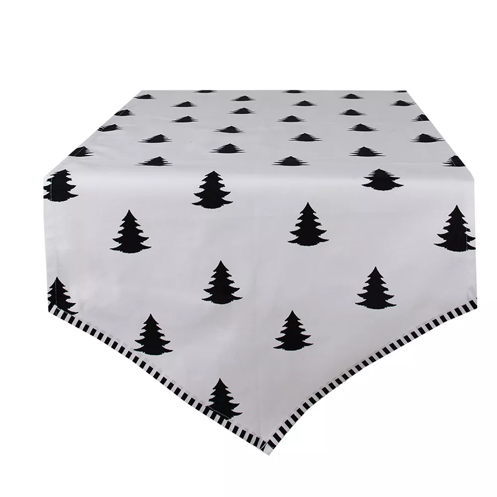 Krásný moderní bílý běhoun na stůl s motivem černých vánočních stromků, z kolekce BLACK & WHITE X-MAS. Tato série obsahuje černobílý vzor s vánočními stromky na černém nebo bílém pozadí. S předměty, jako jsou talíře, hrnky, kuchyňské zástěry, kuchyňské utěrky, chňapky a kuchyňské rukavice, můžete rychle vytvořit klidnou vánoční atmosféru na stole i v kuchyni.
