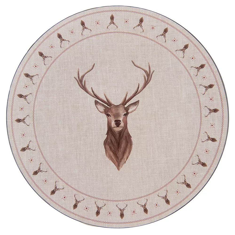 Dekorativní béžový talíř s motivem hnědého jelena z kolekce COSY LODGE. Talíř je vhodný jako prostírání pod dezertní a jídelní talíře. Je vyroben ze speciální směsi materiálů: 70 % polypropylenu a 30 % uhličitanu vápenatého. Navzdory jemnému papírovému potisku se tato prostírání snadno udržují. K jejich čištění stačí použít suchý nebo lehce navlhčený hadřík a potisk zůstane neporušený. Není vhodný pro mytí v myčce nádobí.
