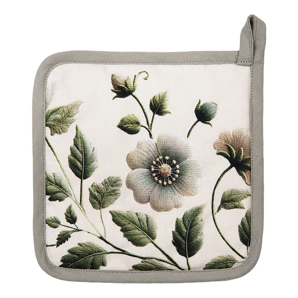 Krásná dekorativní béžová chňapka s květinovým motivem. Jedinečný kousek, který skvěle doplňuje další textilie ze stejné řady GENTLY BLOOMING. Chňapka je vyrobena ze 100% bavlny a má polyesterovou výplň pro izolaci, díky níž je odolná vůči teplu. A chňapku lze samozřejmě prát v pračce.