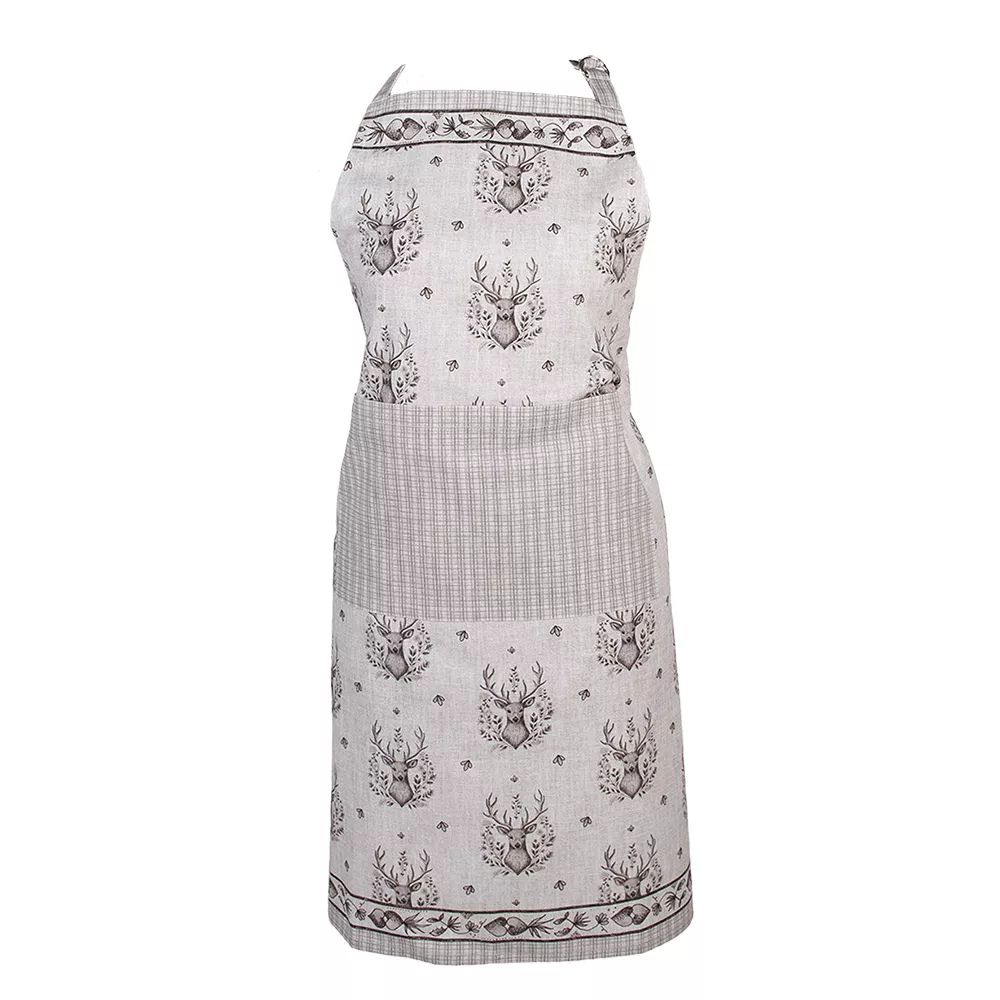 Krásná béžová bavlněná kuchyňská zástěra s motivem majestátního jelena ze série GENTLE WILDERNESS. Jelen, symbol klidu a přírodní krásy, přináší do vaší domácnosti nádech divočiny a eleganci přírody.