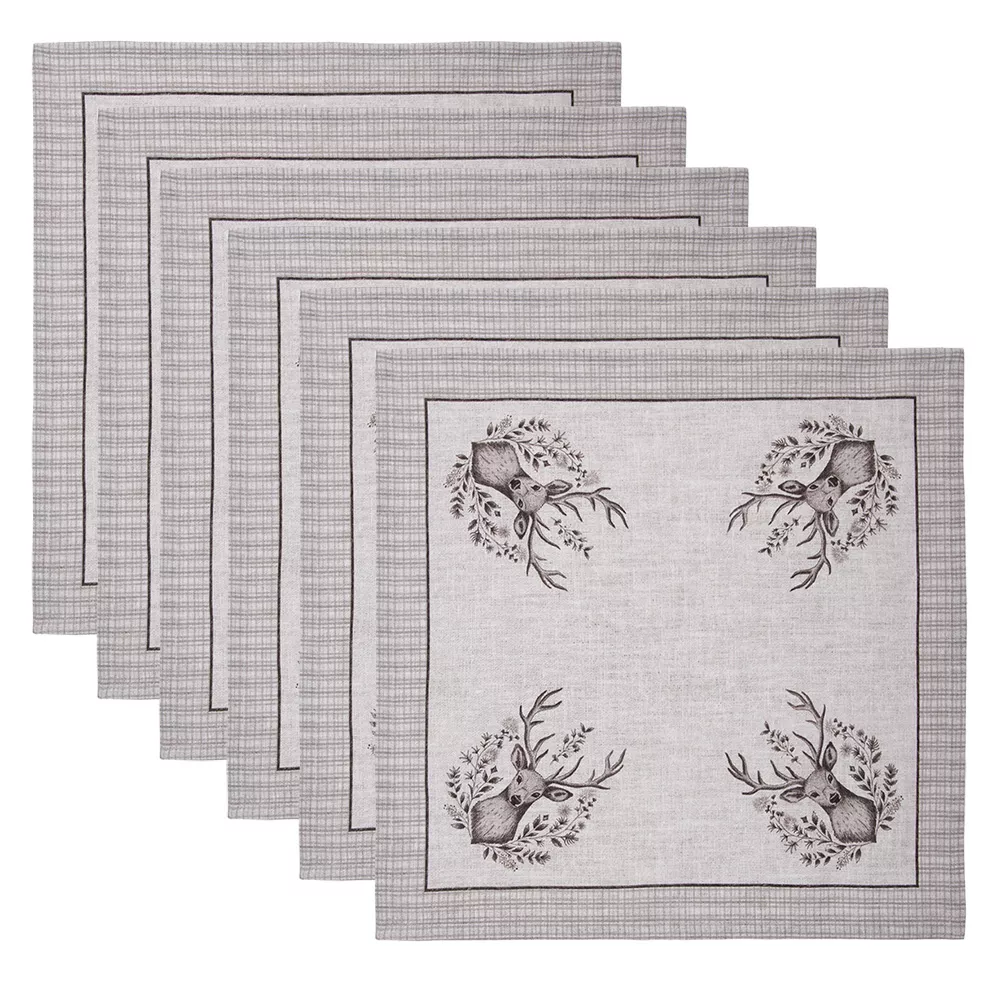 Krásná sada šesti béžových bavlněných ubrousků s motivem majestátního jelena ze série GENTLE WILDERNESS. Jelen, symbol klidu a přírodní krásy, přináší do vaší domácnosti nádech divočiny a eleganci přírody.