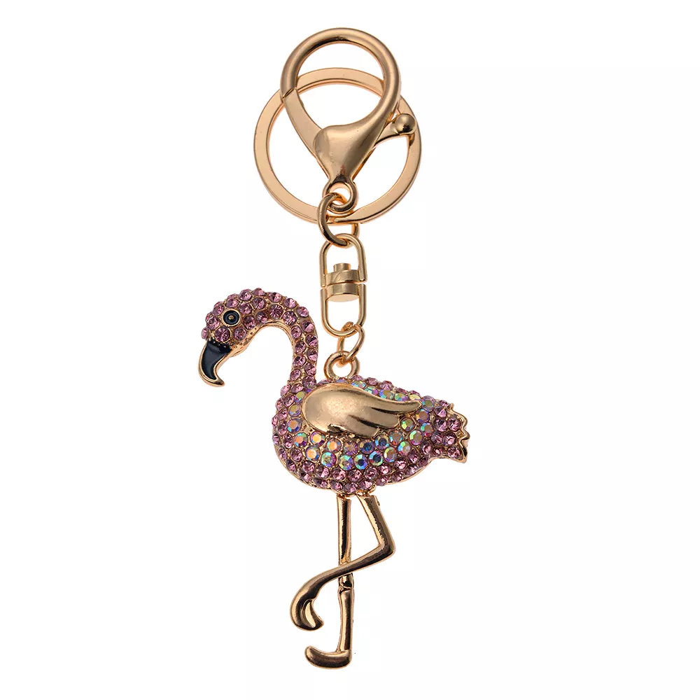 Kovový přívěsek na klíče plameňák v růžové barvě.