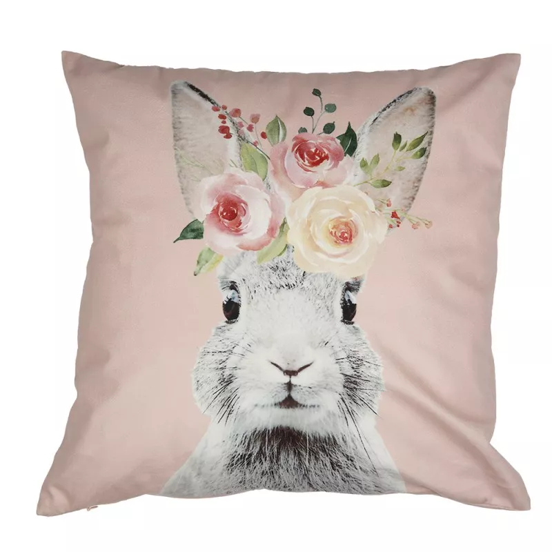 Růžový polyesterový dekorační povlak na polštář s dekorem králíka.