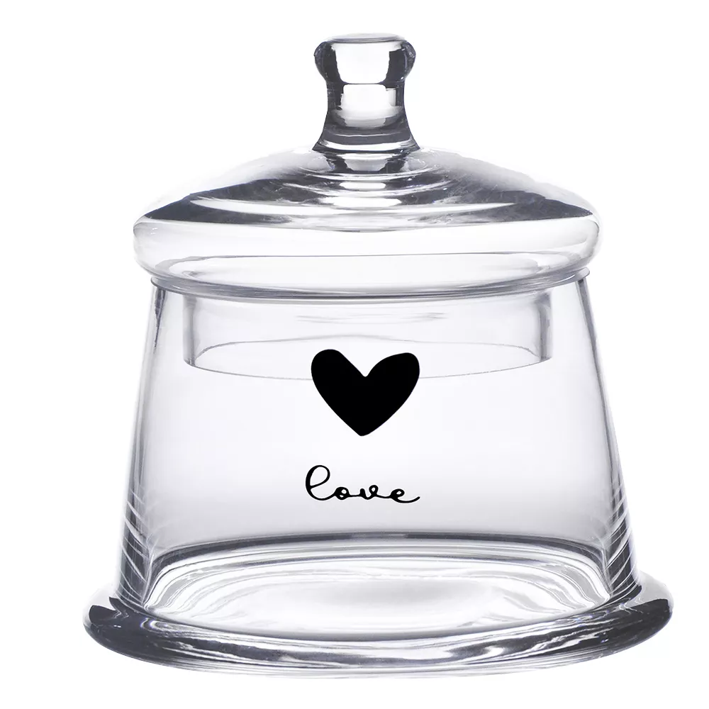 Skleněná dózička s víčkem z kolekce LOVE BIRDS, kde černé srdce a slova jako LOVE vytvářejí moderní a romantickou atmosféru. Každý kus vyzařuje atmosféru náklonnosti a něhy a proměňuje okamžiky u stolu v láskyplný zážitek.