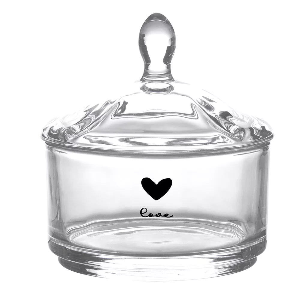 Krásná průhledná skleněná dózička na cukrovinky z kolekce LOVE BIRDS, kde černé srdce a slova jako LOVE vytvářejí moderní a romantickou atmosféru. Každý kus vyzařuje atmosféru náklonnosti a něhy a proměňuje okamžiky u stolu v láskyplný zážitek.