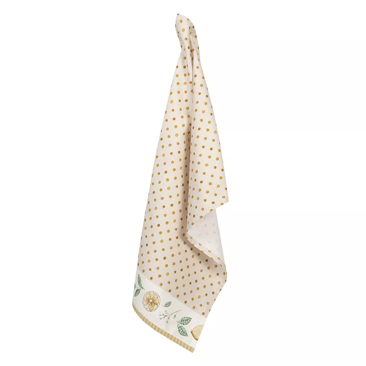 Bavlněná utěrka z textilní kolekce LEMONS AND LEAFS. Léto na vrcholu! S touto sérií okamžitě přenesete slunce do svého domova. Krásně ilustrované obrázky citronů hrají v této kolekci právem hlavní roli. Barevná kombinace žluté, bílé a zelené na béžovém pozadí je pro léto přímo stvořená.