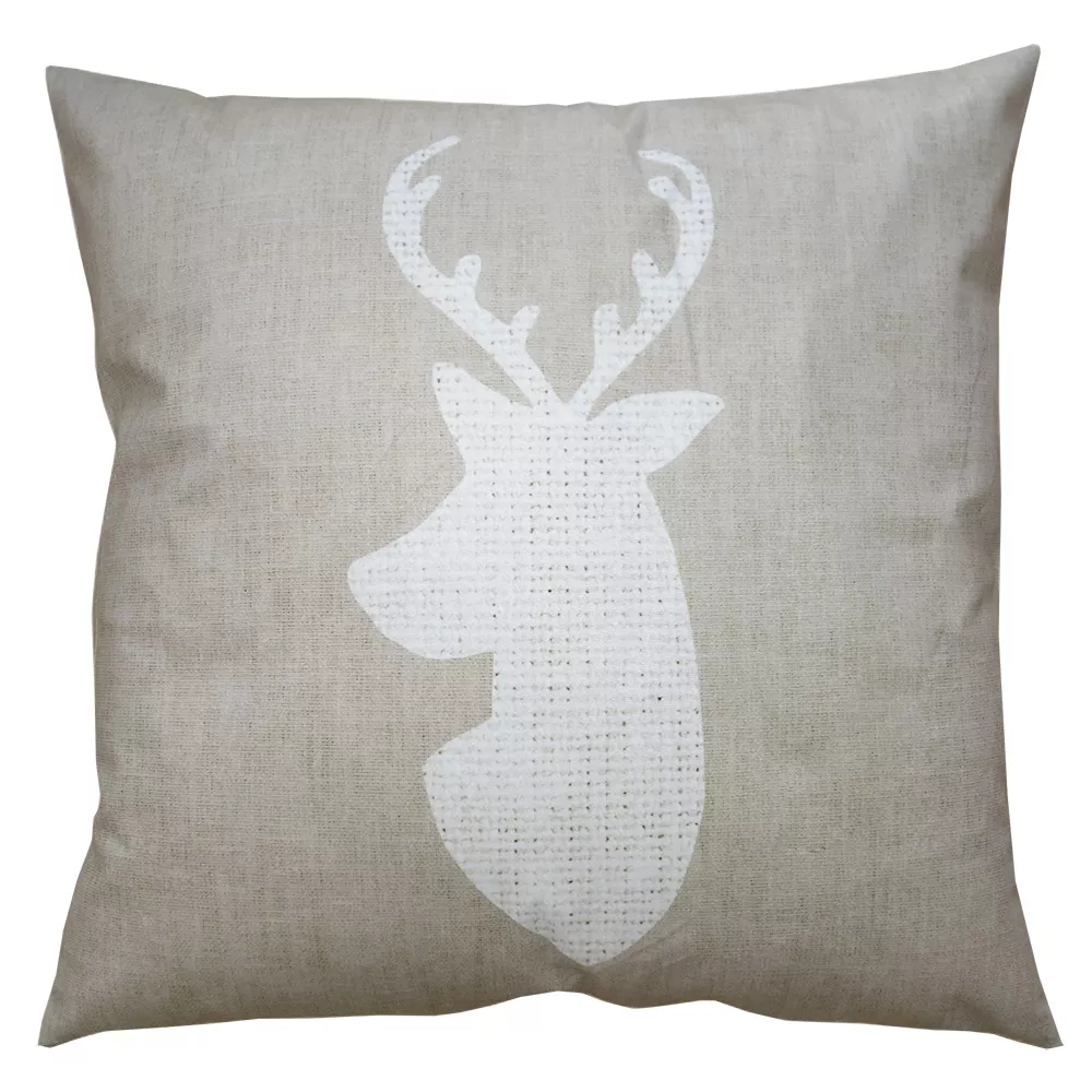 Povlak na dekorační polštář z polyesteru, béžový, s motivem jelena, z textilní série NATURAL WINTER VIBES. Tato kolekce bytového textilu, zalitá klidnými béžovými tóny, zahrnuje přirozenou krásu zimy. Díky různým motivům, včetně hravých jelenů, majestátních borovic a inspirativních textů, tato série oživí kouzlo Vánoc v každém koutě vašeho domova.