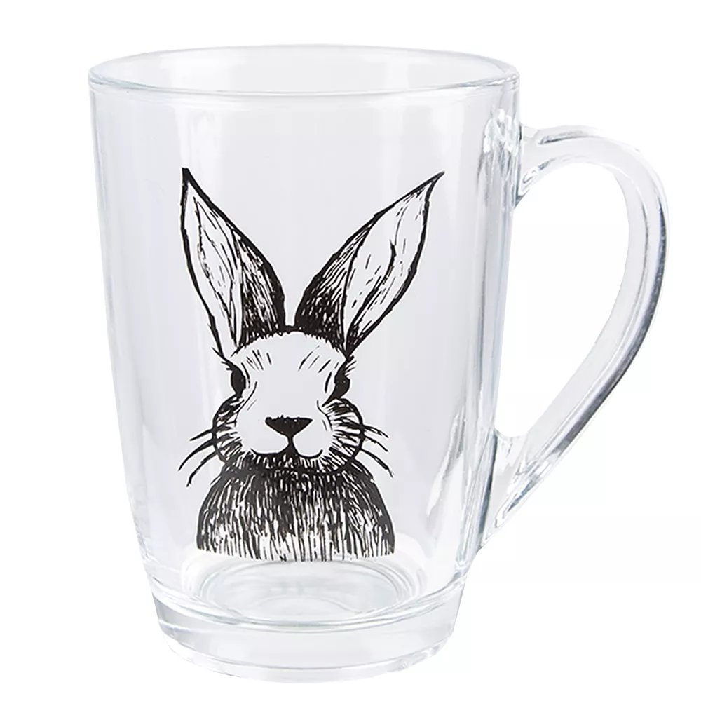 Krásný skleněný hrníček s roztomilým obrázkem zajíčka. Ideální pro vychutnávání čaje. Krásně vypadá na podnosu nebo na stole. Skvělý nápad na dárek a dokonalá velikonoční dekorace.