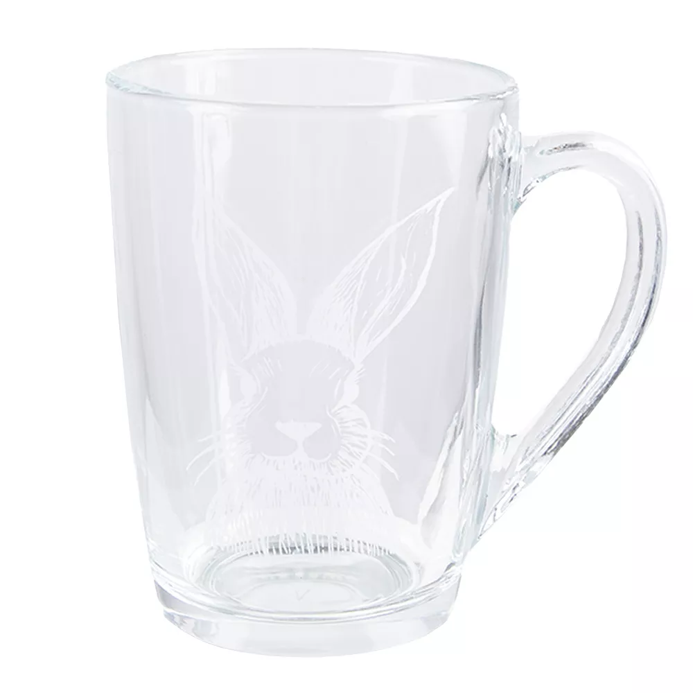 Krásný skleněný hrníček s roztomilým obrázkem zajíčka. Ideální pro vychutnávání čaje. Krásně vypadá na podnosu nebo na stole. Skvělý nápad na dárek a dokonalá velikonoční dekorace.