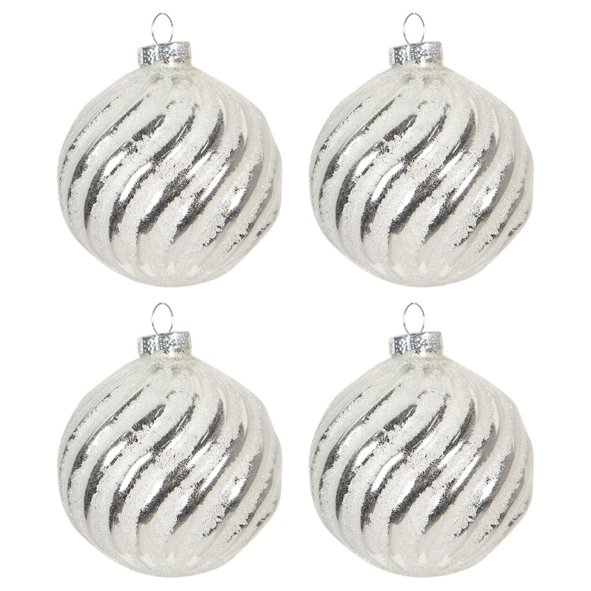 Sada čtyř dekorativních, luxusních skleněných vánočních ozdob v klasickém stylu, ve stříbrné barvě.